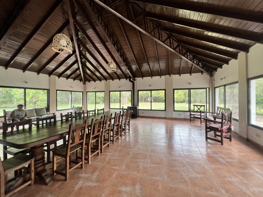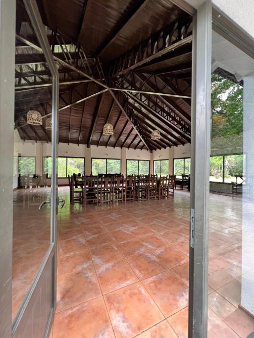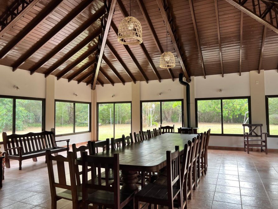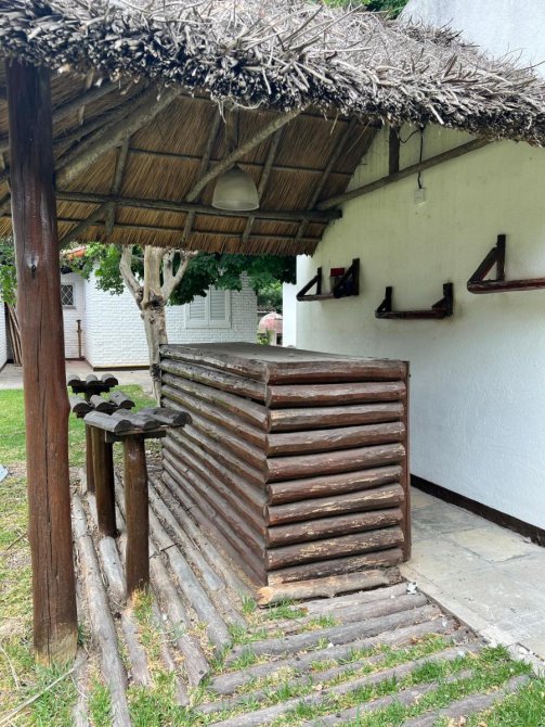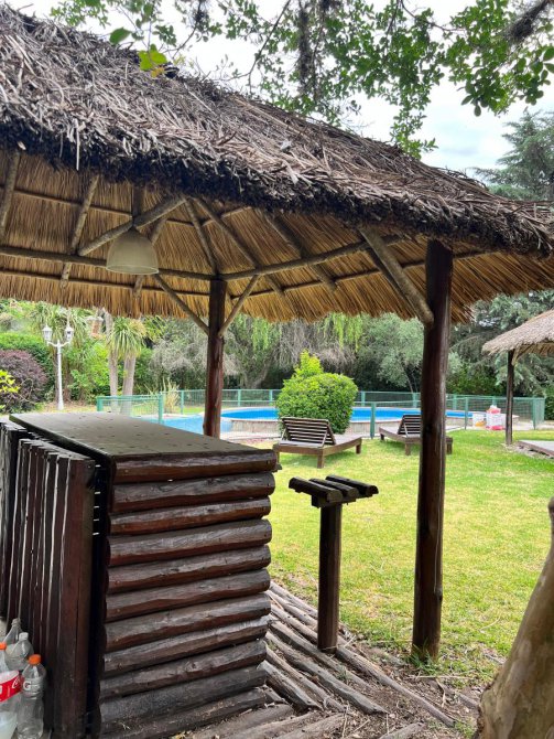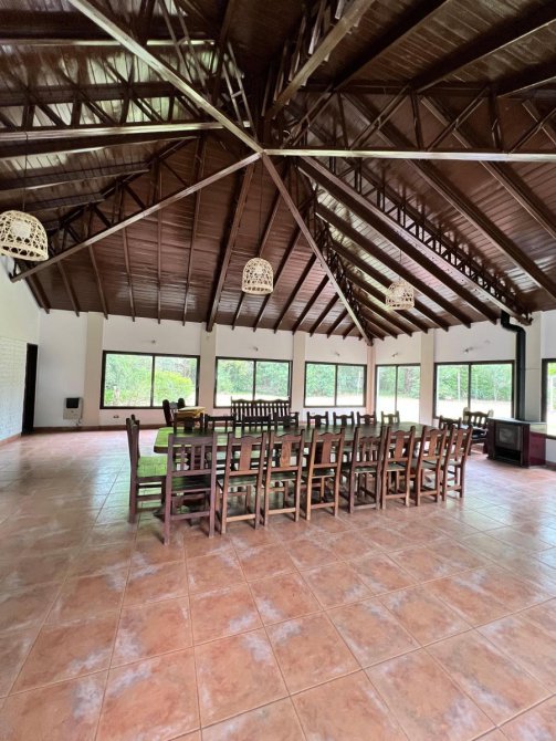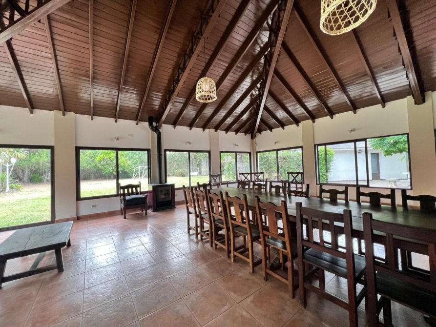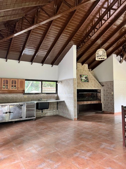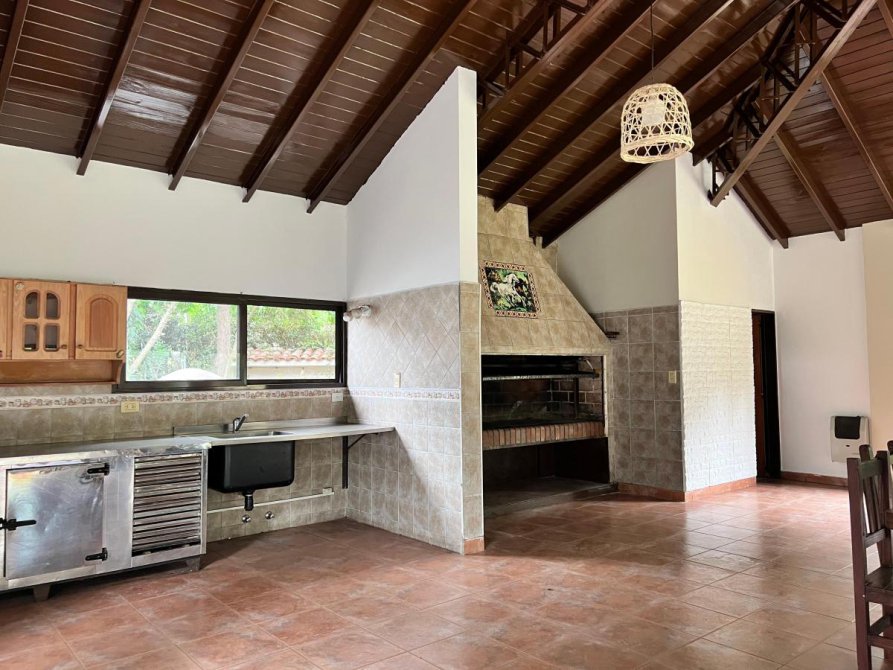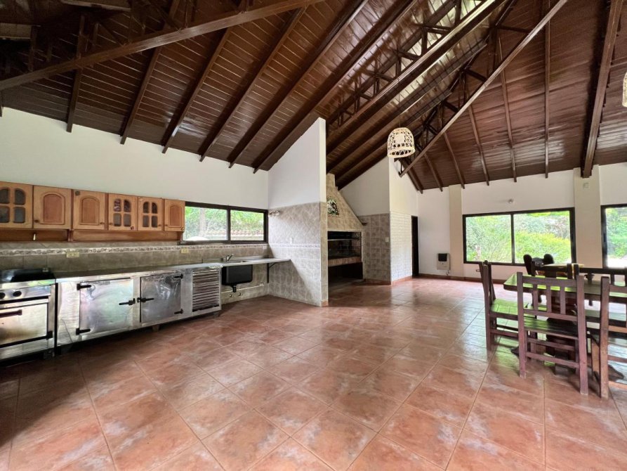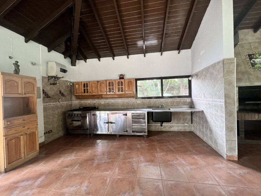 Gran quincho cerrado de 12x12 con cocina industrial y heladera bajo mesada industrial, gran parrilla y baño