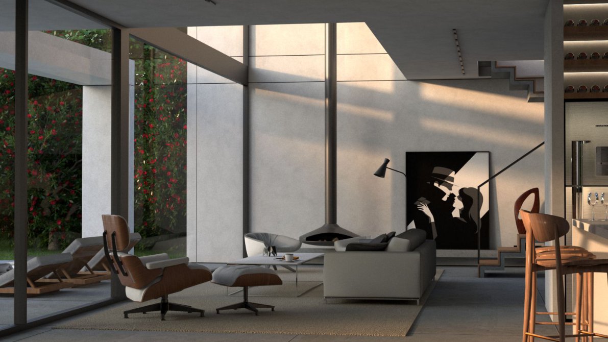 El espacio de living con un diseño moderno de techo en doble altura generando en la planta alta un hall distribuidor hacia los dormitorios muy luminoso.
